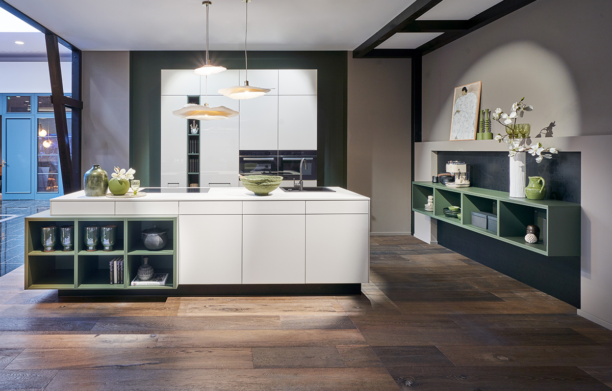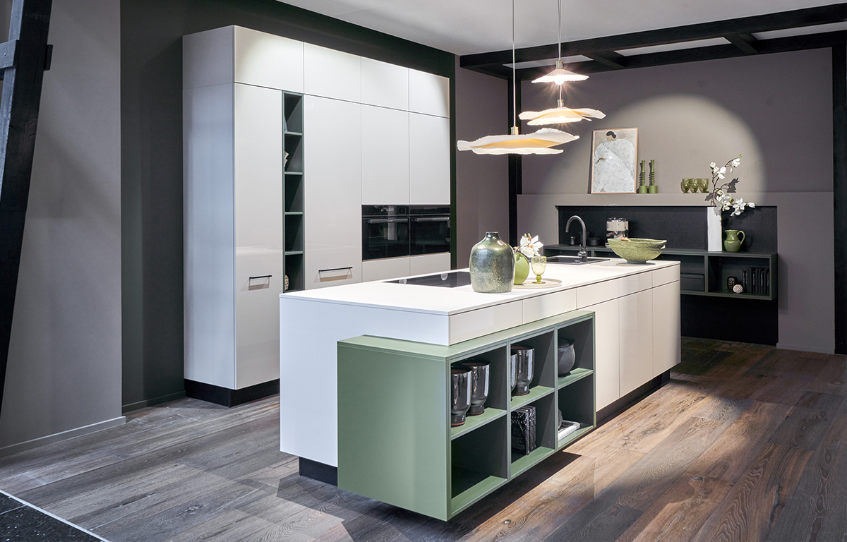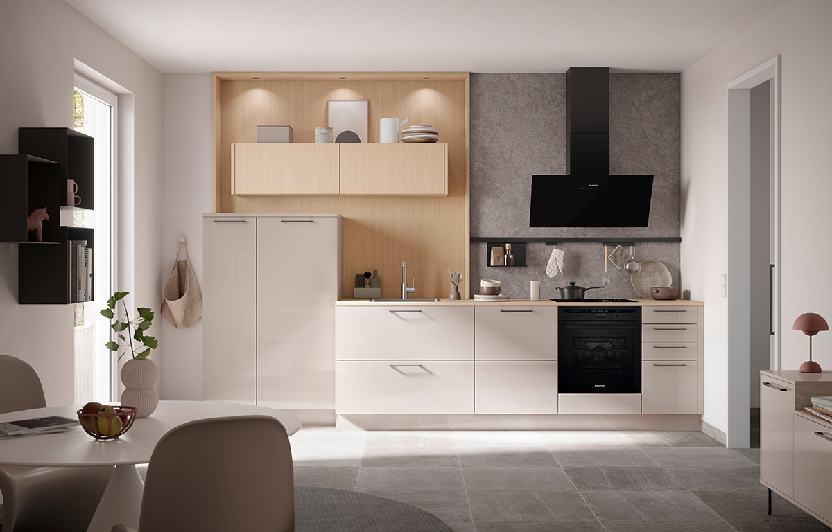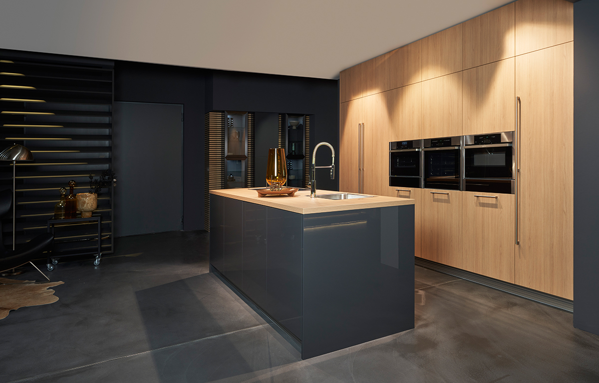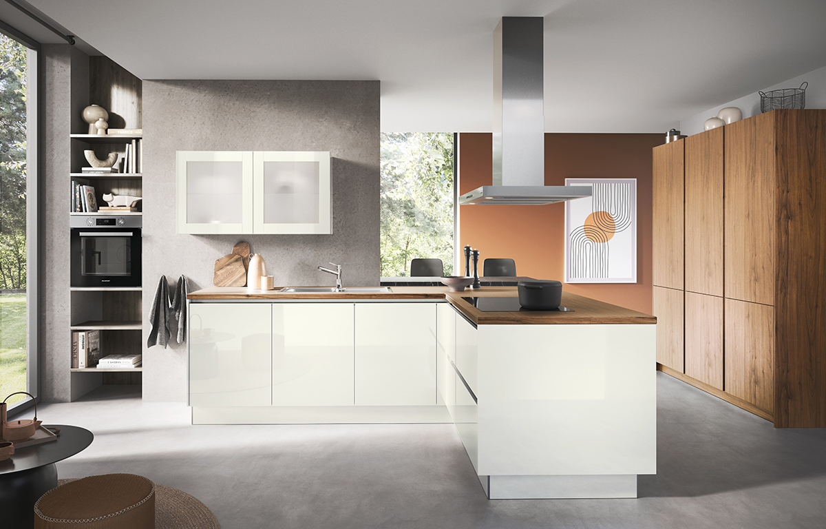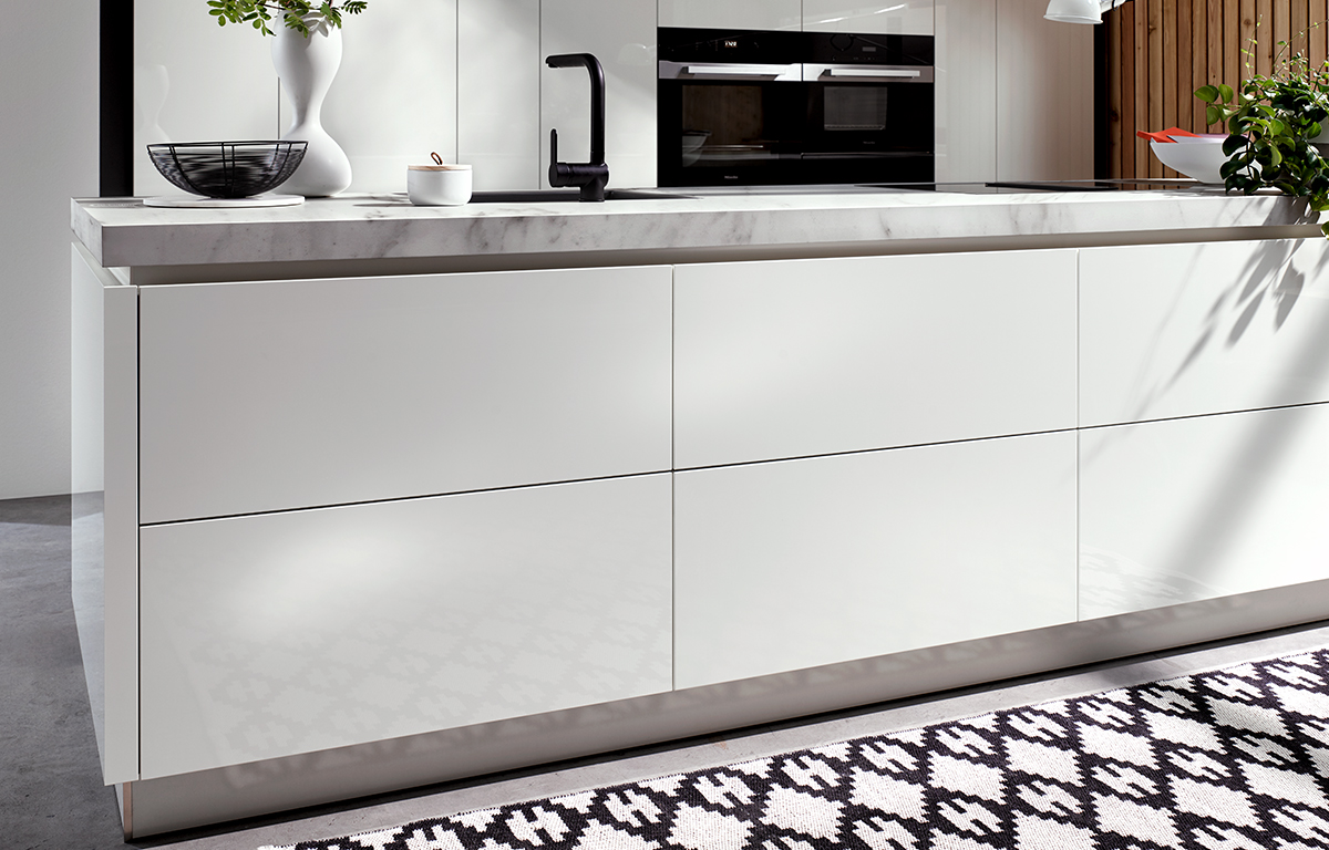 The AV2130 kitchen impresses with its high‑gloss lacquered fronts (PerfectSense lacquer laminate) in elegant reflective tones that add a sense of spaciousness and prestige to any room.