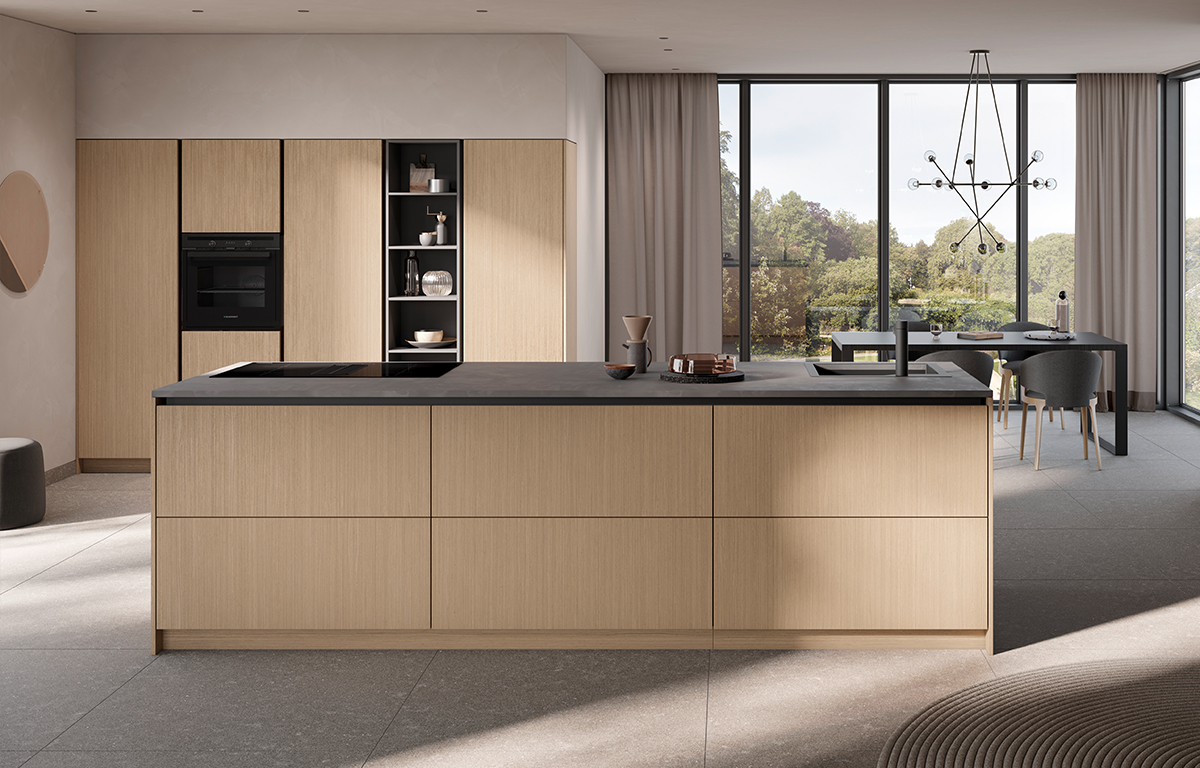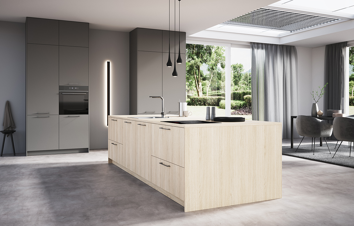 Vertikalna struktura lesa kuhinje AV2040 je v resnici imitacija. Strukturirana površina na otip deluje izjemno pristno, toplo in naravno. Vrata so zaščitena z mat lakirano površino PerfectSence.